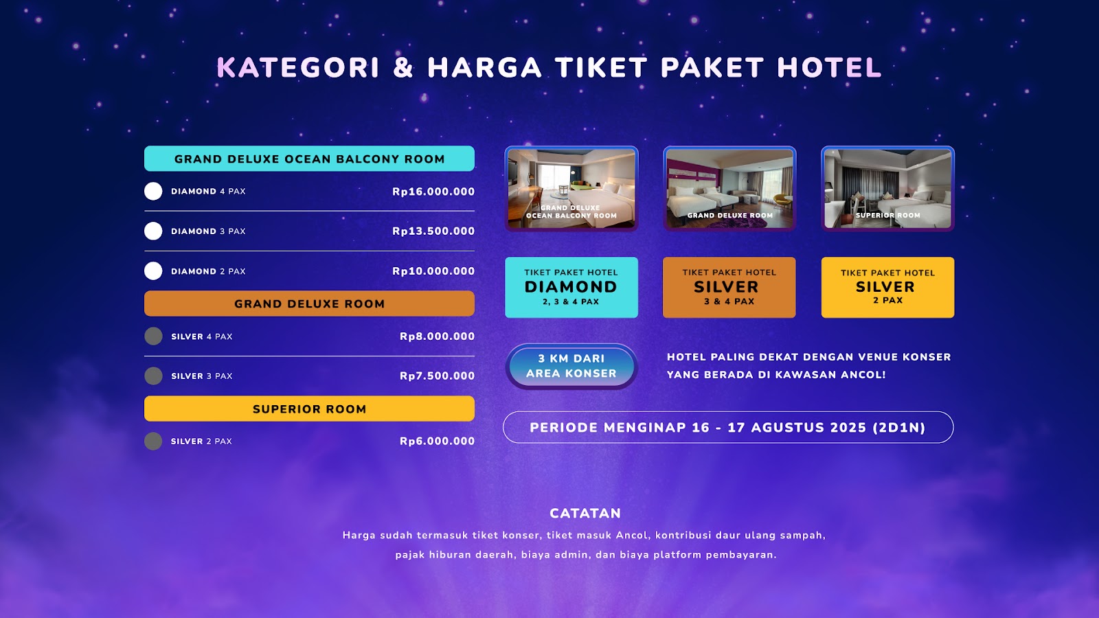 Tiket Konser JUMBO tersedia dalam berbagai kategori, dengan harga mulai dari Rp250.000, sehingga bisa disesuaikan dengan kebutuhan dan kenyamanan masing-masing keluarga. Bagi yang ingin menikmati pengalaman lebih lengkap, tersedia juga paket bundling dengan hotel tematik JUMBO di Mercure Convention Center Ancol serta merchandise eksklusif.