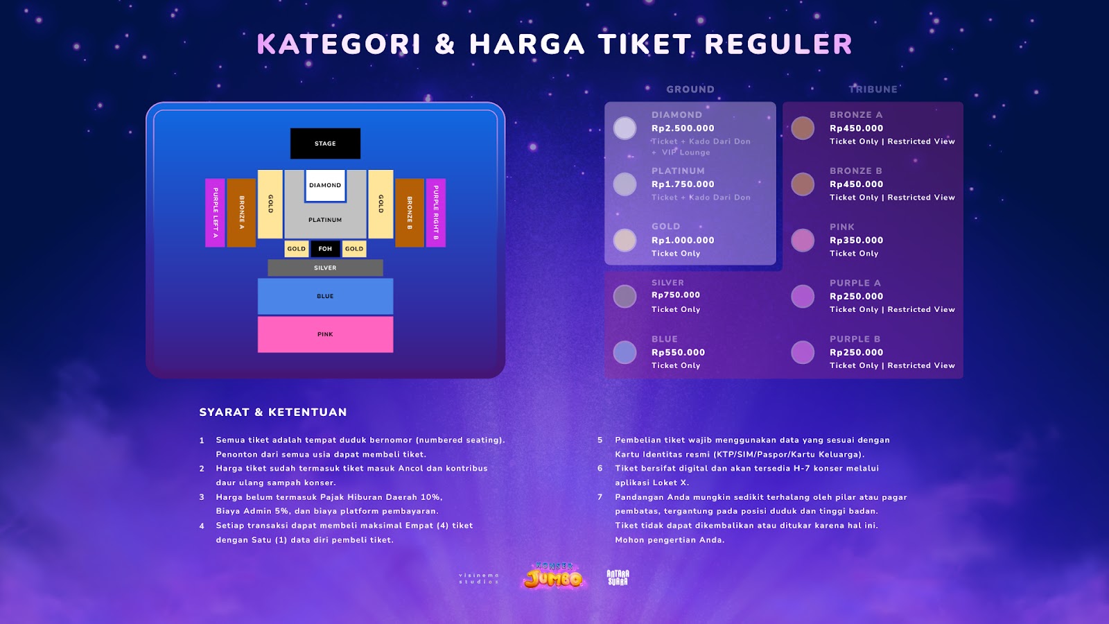 Tiket tersedia mulai 30 Juni 2025 melalui Loket.com. Untuk informasi lebih lanjut dan pembelian tiket, kunjungi loket.com/konserjumbo.