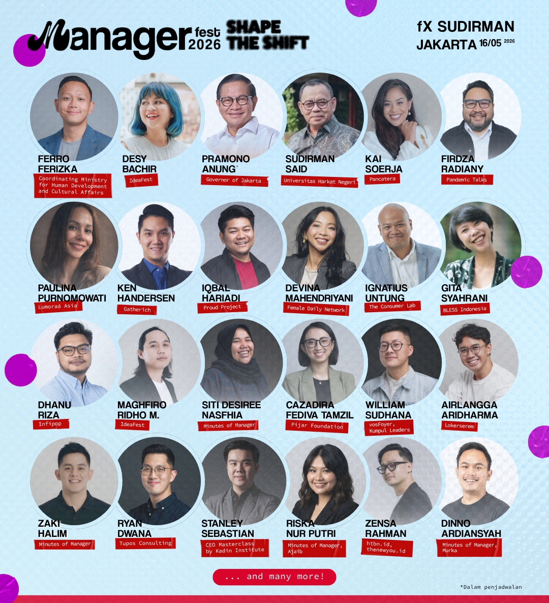 Deretan pembicara yang dijadwalkan hadir meliputi Pramono Anung, Sudirman Said, Kai Soerja, Iqbal Hariadi, Paulina Purnomowati, Dessy Bachir dan masih banyak pembicara Manager Fest 2026 yang masing-masing membawa pengalaman dalam memimpin, membangun, serta menavigasi perubahan di berbagai sektor.